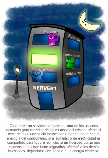 Bajo este esquema de servicio, es común que si se llega a presentar un excesivo consumo de recursos del servidor por parte de alguno de los usuarios ahí hospedados, los demás usuarios se ven afectados al mismo tiempo.
